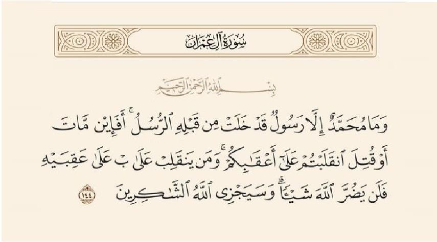 القرآن الكريم-الكوثر: قال الله العظيم في محكم كتابه الكريم: (وما محمد الا رسول قد خلت من قبله الرسل، أفإن مات أو قُتل انقلبتم على أعقابكم ومن ينقلب على عقبيه فلن يضر الله شيئاً وسيجزي الله الشاكرين)، (سورة آل عمران المباركة: آية ١٤٤).