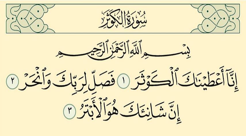 القرآن الكريم-الكوثر: قال الله العظيم في محكم كتابه الكريم: (بِسْمِ اللَّـهِ الرَّحْمَـٰنِ الرَّحِيمِ: إِنَّا أَعْطَيْنَاكَ الْكَوْثَرَ ﴿١﴾ فَصَلِّ لِرَبِّكَ وَانْحَرْ ﴿٢﴾ إِنَّ شَانِئَكَ هُوَ الْأَبْتَرُ ﴿٣﴾ صدق الله العلي العظيم. من بلاغة سورة الكوثر المباركة؛ الهندسة اللغوية في سورة الكوثر: