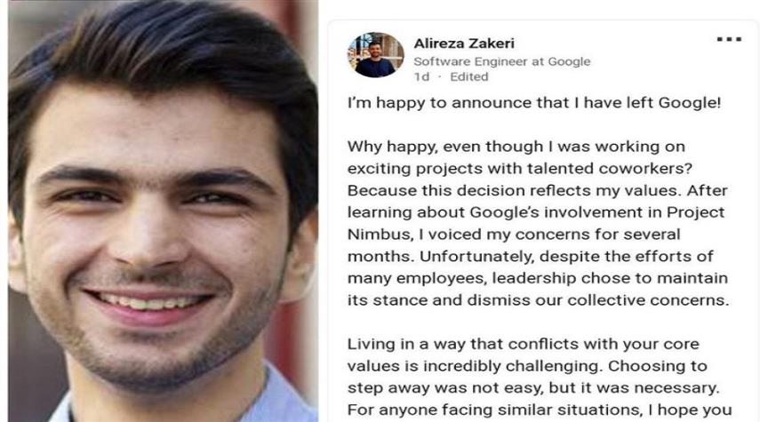 أعلن علي رضا ذاكري، الحاصل على الميدالية الذهبية في الأولمبياد العالمي للمعلوماتية، استقالته من شركة غوغل بسبب تعاونها مع الكيان الصهيوني في مشروع "نيمبوس".