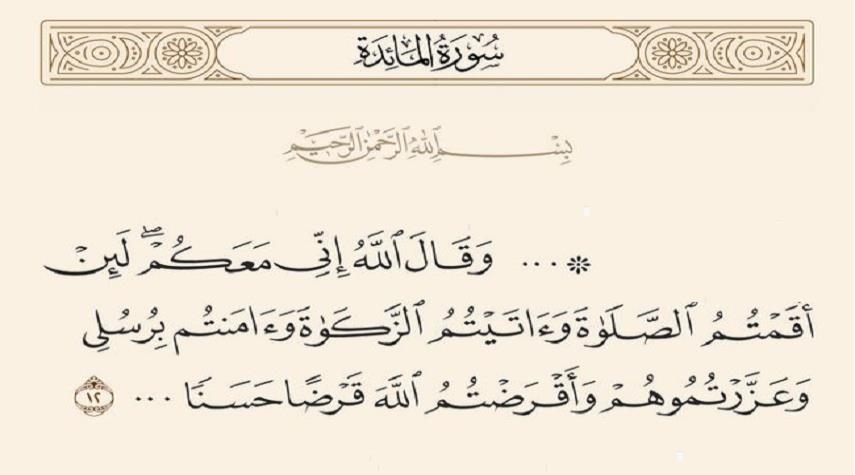 القرآن الكريم-الكوثر: قال الله في محكم كتابه الكريم: (...لَئِنْ أَقَمْتُمُ الصَّلاةَ وَ آتَيْتُمُ الزَّكاةَ وَ آمَنْتُمْ بِرُسُلِي وَ عَزَّرْتُمُوهُمْ وَ أَقْرَضْتُمُ اللَّـهَ قَرْضاً حَسَنًا...) (سورة المائدة المباركة، آية:12).