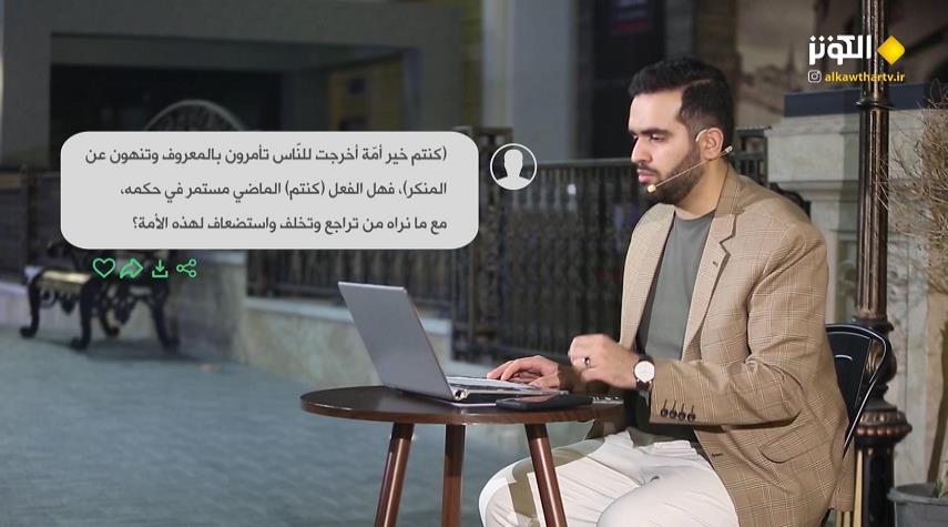 في برنامج اسئلتكم على قناة الكوثر الفضائية، تحدث الباحث الاسلامي الدكتور الشيخ طاهر الغرباوي حول (كنتم خير أمة أخرجت للناس تأمرون بالمعروف وتنهون عن المنكر)، فهل الفعل (كنتم) الماضي مستمر في حكمه، مع ما نرى من تراجع وتخلف واستضعاف لهذه الأمة ؟ مشيرا الى ان النبي وأهل البيت (عليهم السلام) هم سادة هذه الأمة، وهم المؤمنون الحقيقيون الآمرون بالمعروف والناهون عن المنكر.