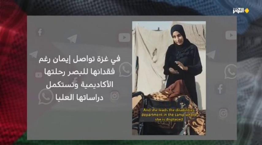تحدثت فتاة فلسطينية "إيمان" عن استكمال دراستها الماجستير رغم فقدانها للبصر عبر التعليم الإلكتروني وتقول رغم الألم، الأمل موجود، وإن شاء الله تعود الأيام كما كانت أحسن وأفضل بإذن الله عز وجل.