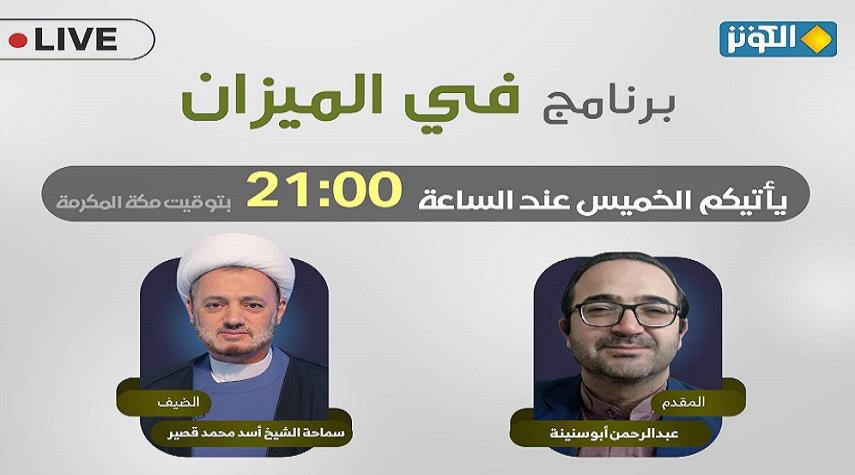 سيبحث برنامج في الميزان موضوع التراث الروائي وصناعة التوحش وذلك بحضور الاستاذ الحوزوي سماحة السيد " اسد محمد قصير" من ايران، والشيخ شاكر العاروري و فضيلة الشيخ سامي العسلة.