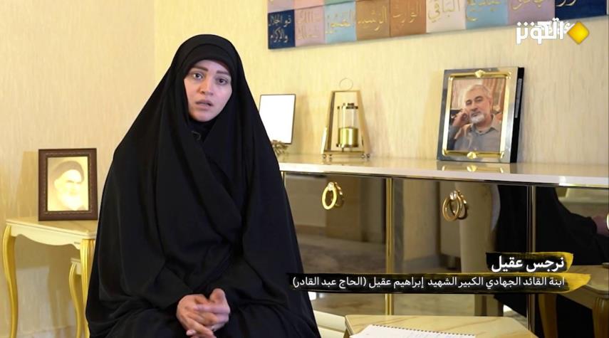 تحدثت السيدة نرجس عقيل ابنة الشهيد الحاج إبراهيم محمد عقيل عن تأسيس والدها الشهيد عبدالقادر لوحدة الارضوان وكذلك عن رؤيته الاستراتيجة في مسار المقاومة.