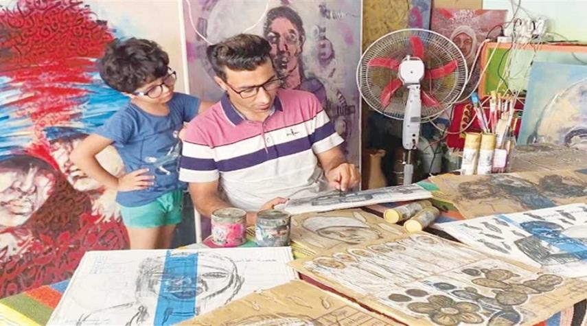 فنان تشكيلي فلسطيني يرسم معاناة شعبه على الصناديق الكرتونية
