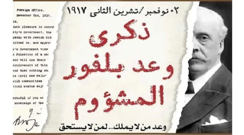 يصادف يوم الثاني نوفمبر/تشرين الثاني 1917 الذكرى السنوية الـ 107 لـ "وعد بلفور المشؤوم"، الذي منحت فيه بريطانيا الحق لليهود في إقامة وطن قومي في فلسطين